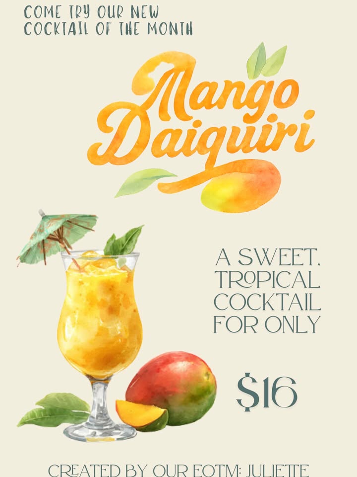 Cocktail of the Month – Mango Daiquiri Come try our new cocktail of the month created by EOTM Juliette – the Mango Daiquiri. This sweet, t...
