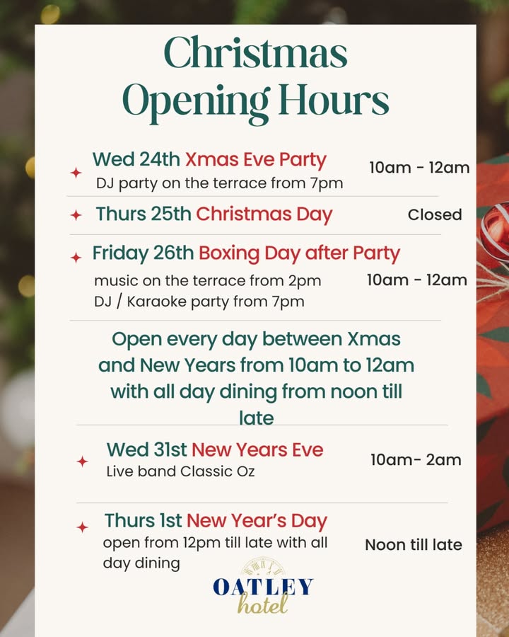 Dear Members and Guests, please take a moment to check our festive season trading hours. As Christmas approaches, we want to ensure you can plan your visits to Oatley Hotel accordingly and make the most of the holiday season with us.
