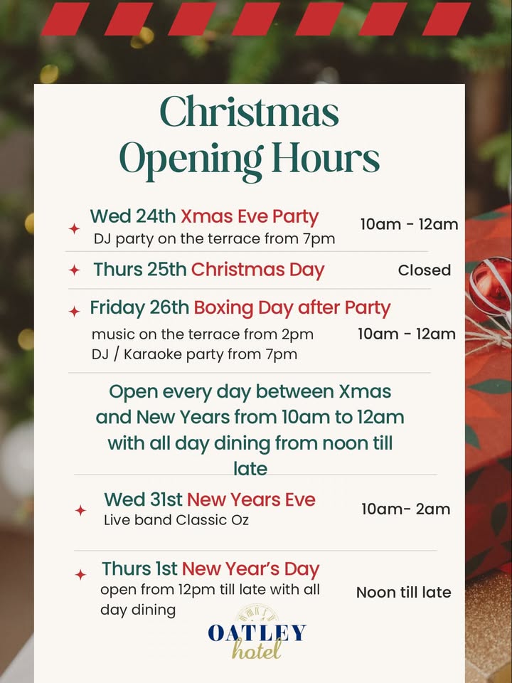 Get ready for a festive season filled with exciting events at Oatley Hotel! Our Christmas opening hours have a unique twist this year, ensuring you have plenty of opportunities to join the fun. Christmas & New Year Opening Hours: We will be closed on Christmas Day but...
